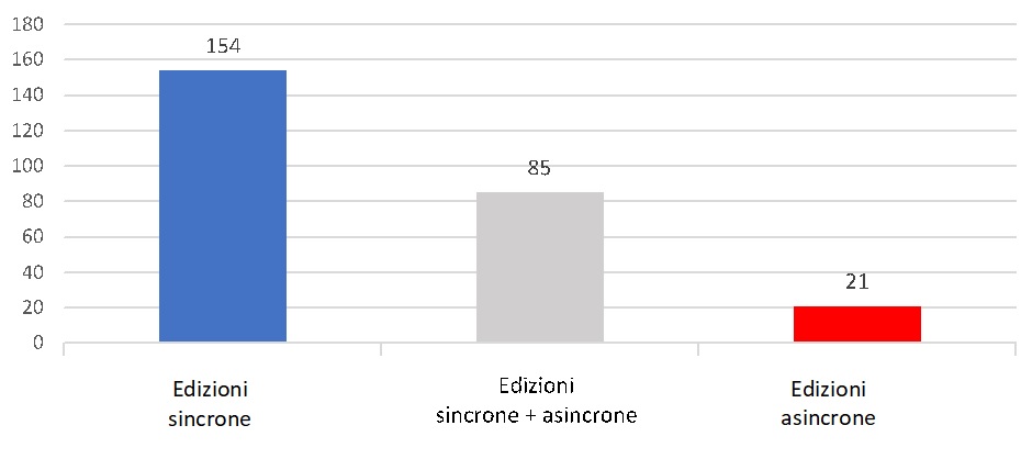 - Corsi sincroni-asincroni: che prevedono una combinazione, in misura variabile, di webinar sincroni e contenuti digitali asincroni.