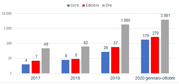 Partendo da alcune esperienze pilota sviluppate in precedenza, e in considerazione delle crescenti esigenze manifestate dalle amministrazioni e dai partecipanti ai corsi, nel 2017 è stata avviata un’azione volta a incrementare progressivamente la quota di formazione fruibile a distanza.